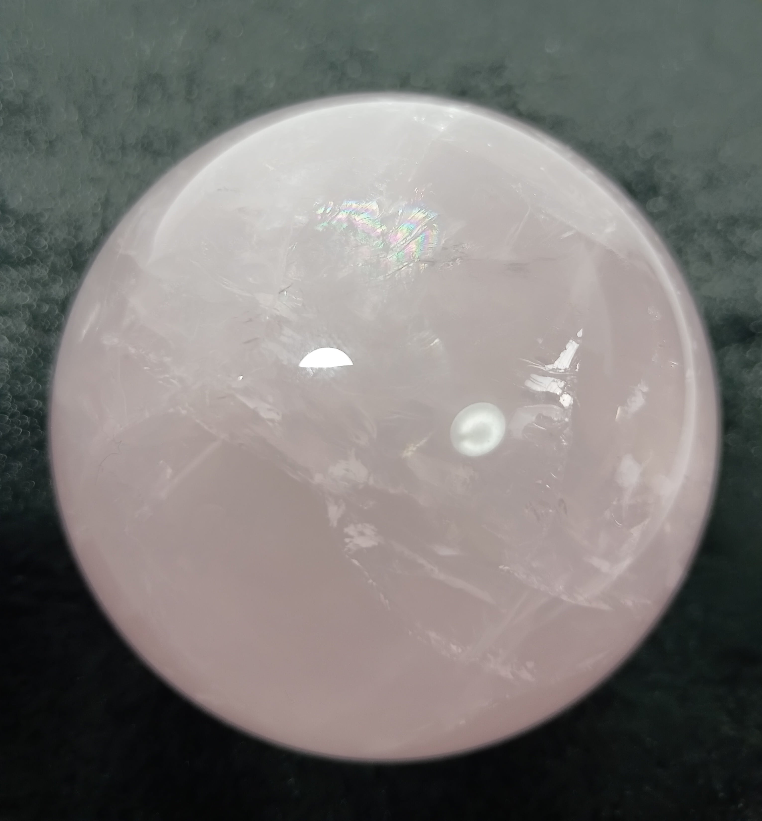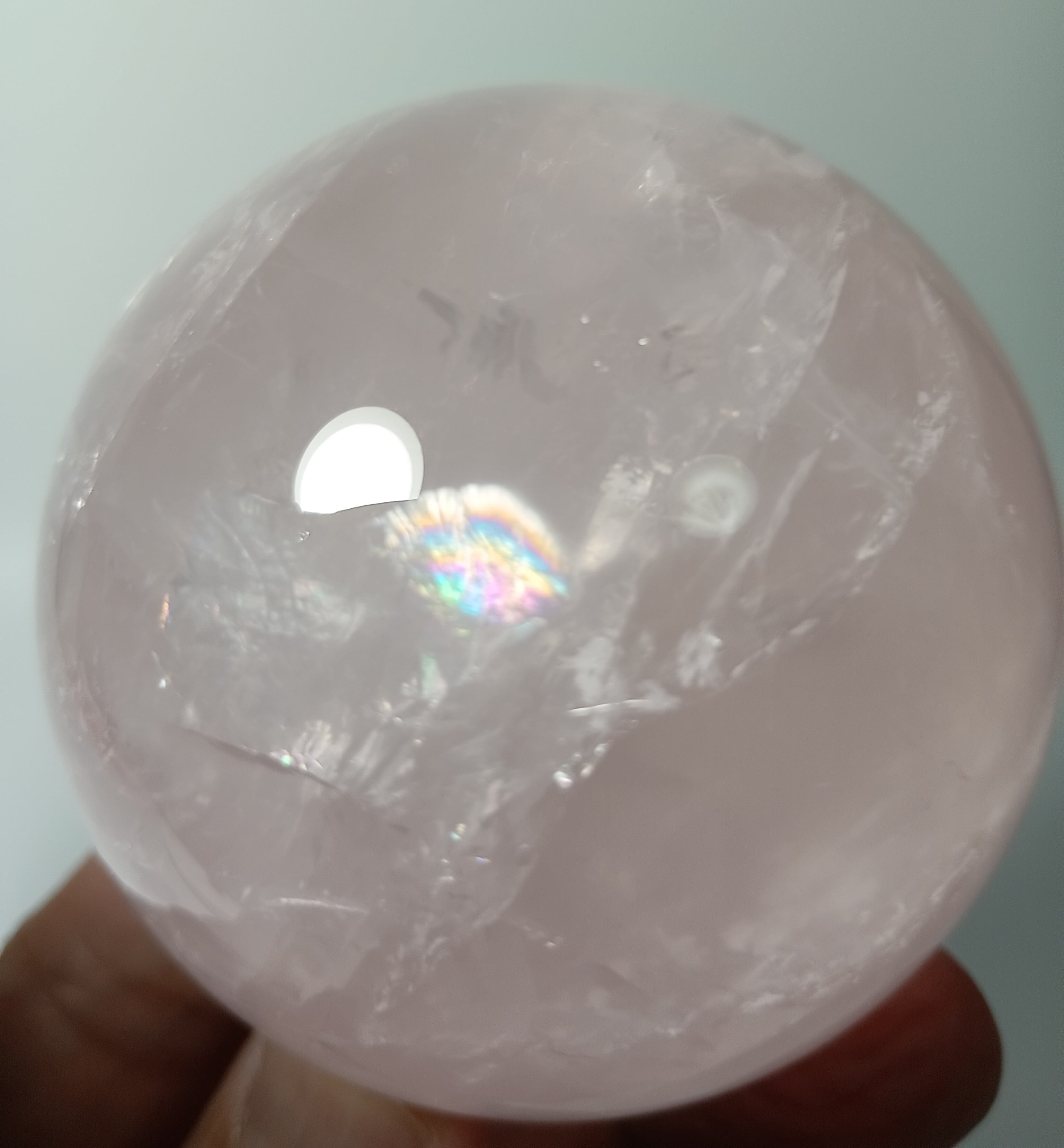 65㎜ ☆高品質☆ ローズクオーツスフィア 虹入り(台付き) マダガスカル産 約412g「愛をまとう癒しの珠」